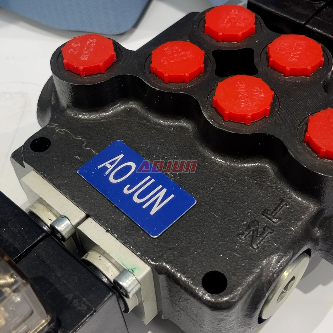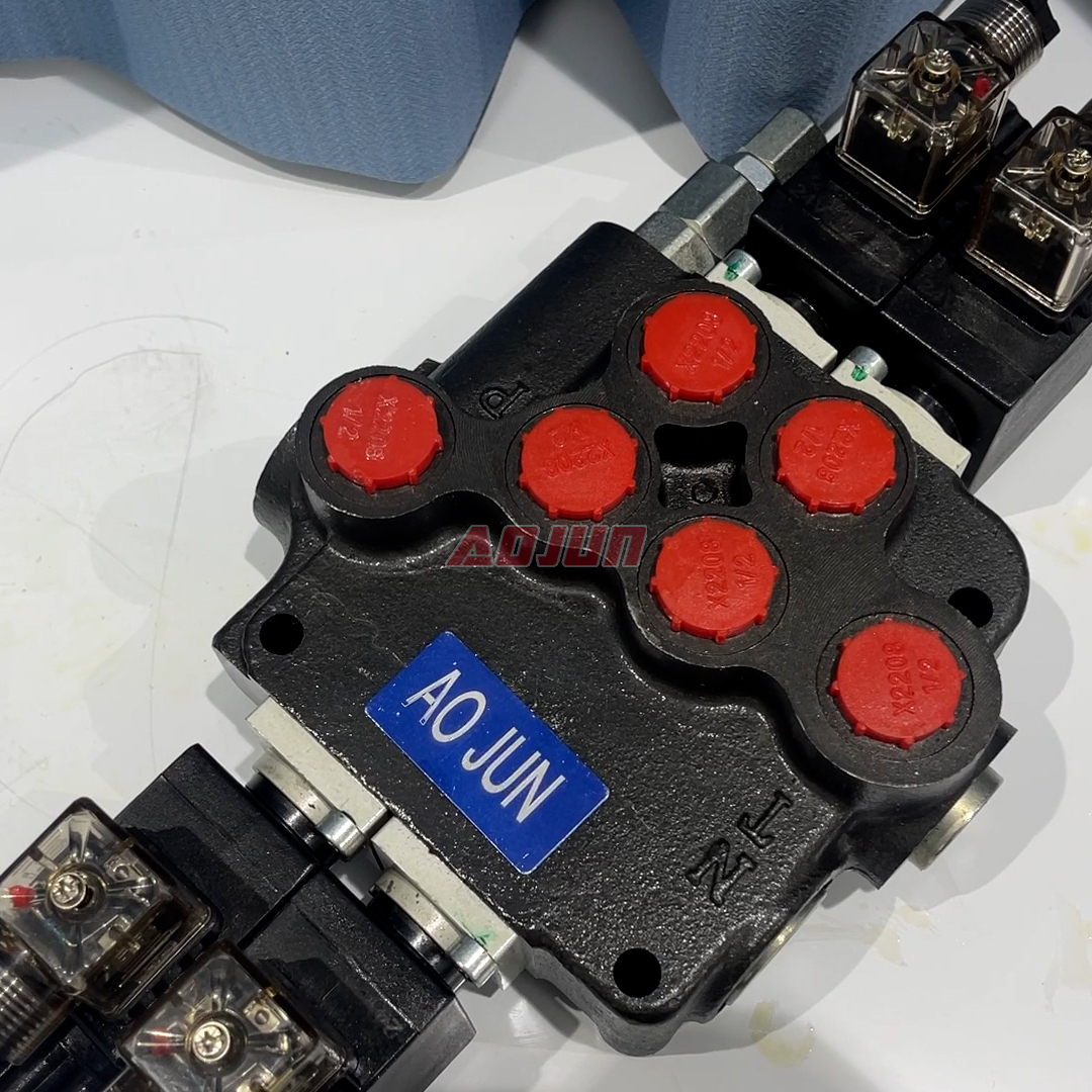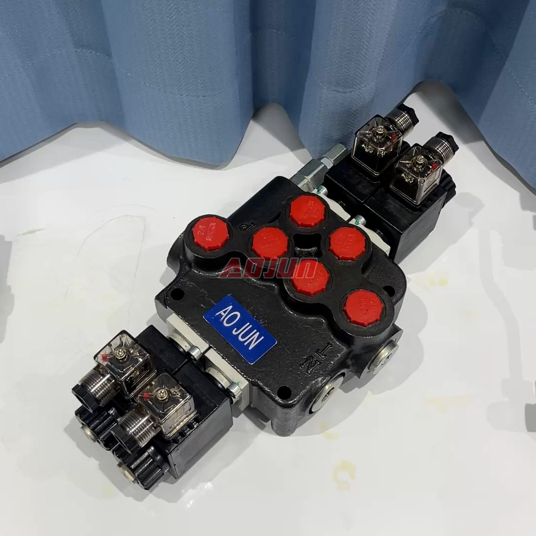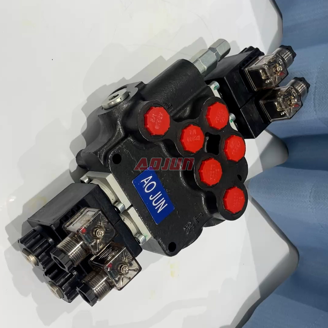 This 2-spool monoblock valve provides electrically actuated directional control for two hydraulic circuits, ideal for compact mobile hydraulic systems requiring fast, repeatable switching.