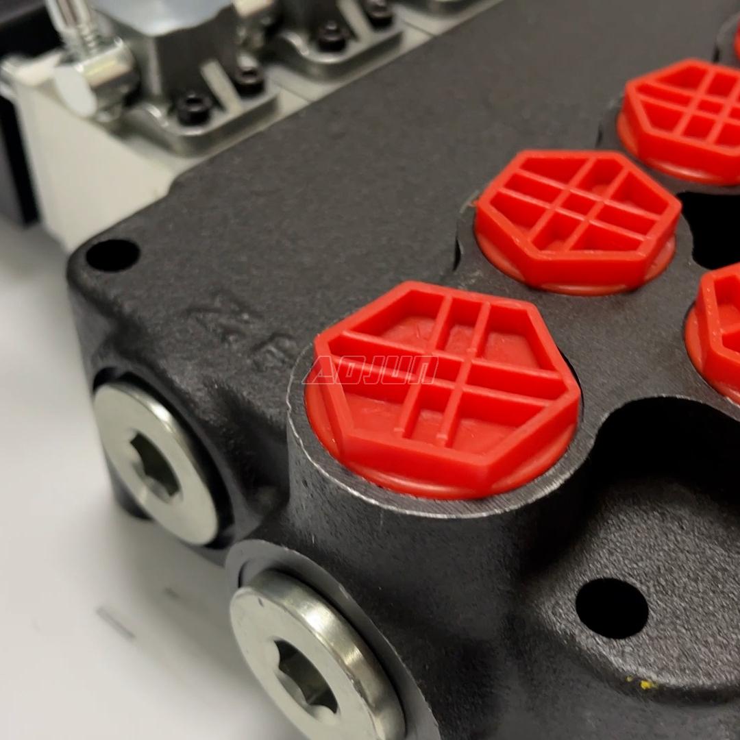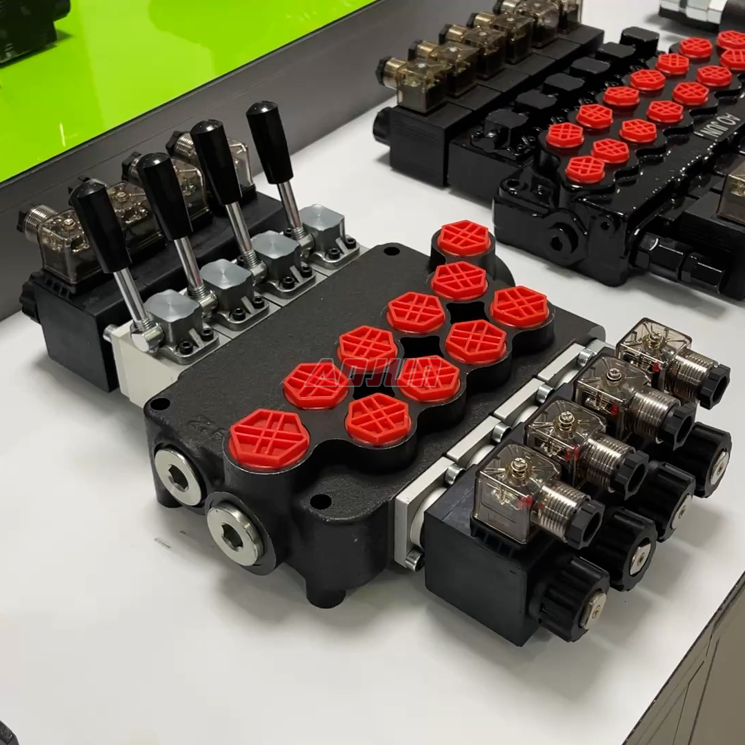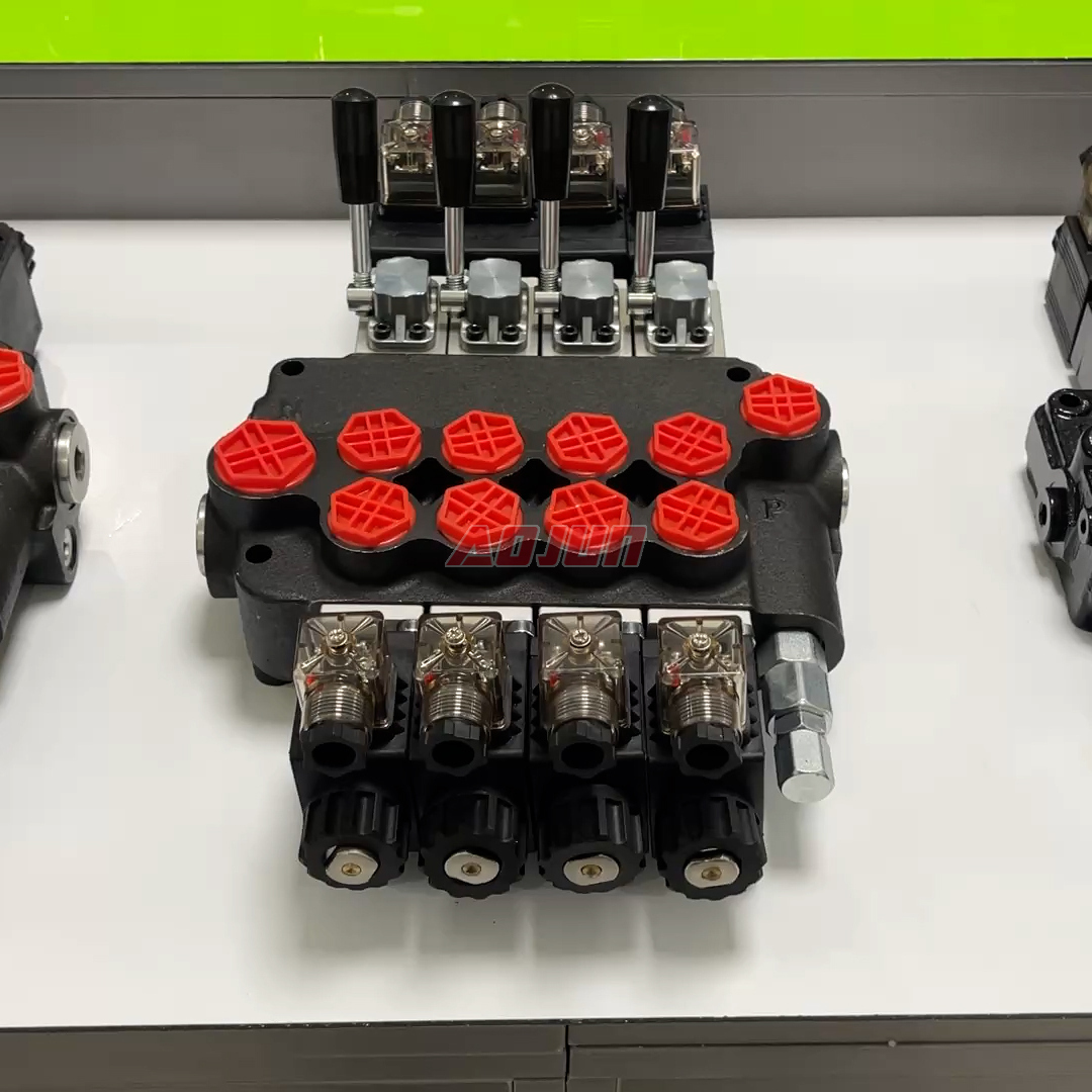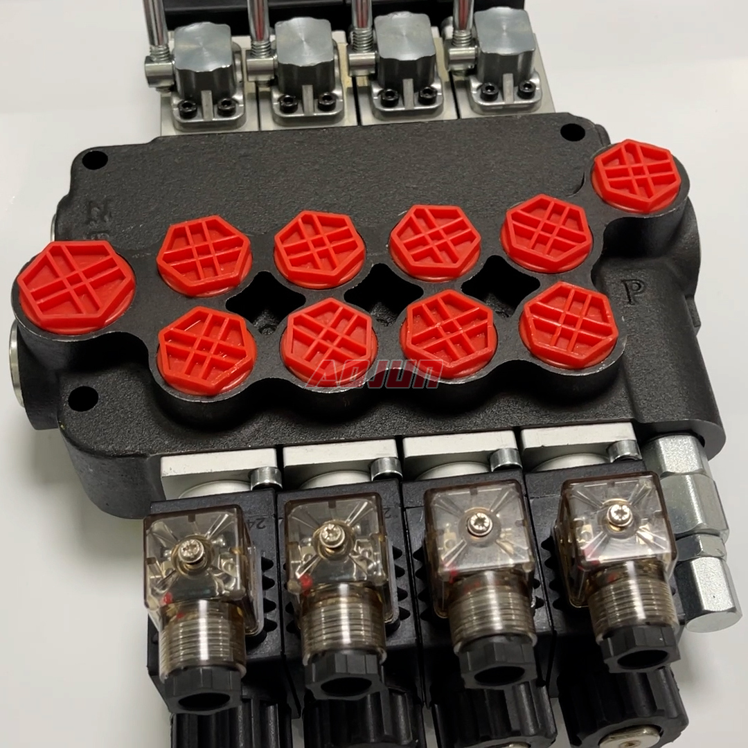 This solenoid-controlled monoblock directional valve provides four independent spool functions in a compact, leak-minimizing one-piece body—ideal for space-limited mobile equipment.