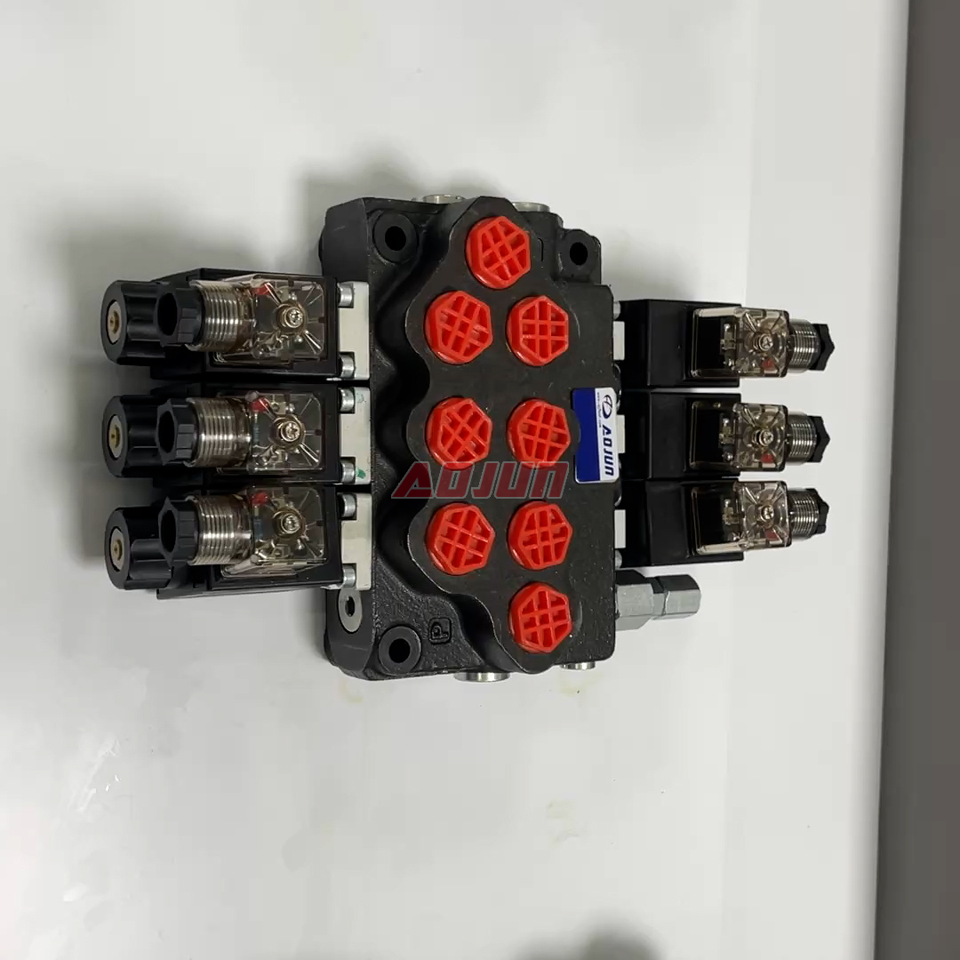 This solenoid-controlled monoblock valve integrates three spool sections in a single compact body to simplify plumbing and reduce leakage points versus sectional stacks. Rated flow is 40 L/min (10.5 gpm) with maximum pressure up to 315 bar (4600 psi), suitable for demanding mobile equipment functions such as boom, bucket, steering, stabilizers, clamps, outriggers, and auxiliary circuits.